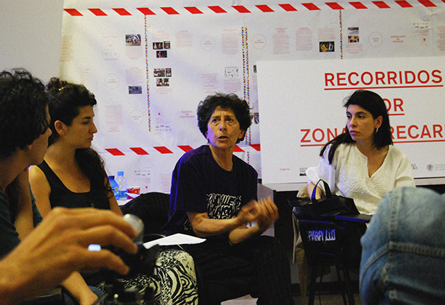 Mesa debate en coloquio con Esther Ferrer y M. Laura Rosa. Recorridos por Zonas Precarias, prácticas artísticas/activistas de mujeres en y ante lo precario, Sala Parpalló, Valencia, España.